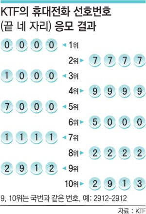 [µ¿¾ÆÀϺ¸] KTF°¡ ÃÖ±Ù ÈÞ´ëÀüÈ µÚ ³× ÀÚ¸®¿¡ ´ëÇÑ ¼±È£¹øÈ£ °ø¸ð¸¦ ½Ç½ÃÇÑ °á°ú 0000, 7777 °°Àº À̸¥¹Ù ¡®Æ÷Ä¿¹øÈ£¡¯°¡ °¡Àå ÀαⰡ ¸¹Àº °ÍÀ¸·Î Á¶»çµÆ´Ù.
