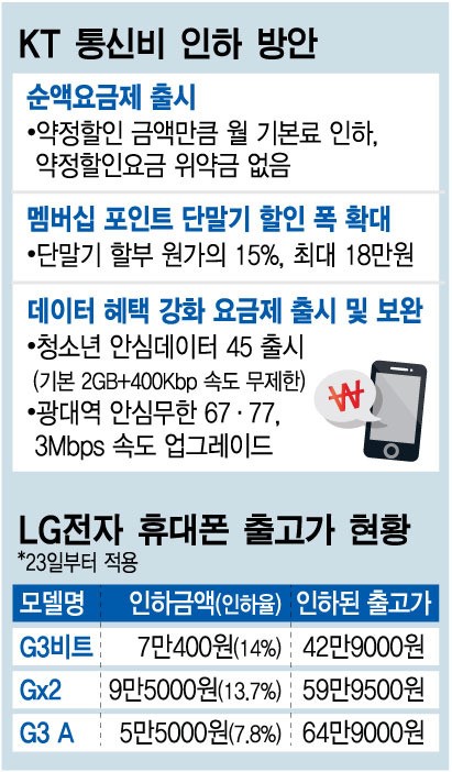 KT°¡ Áö³­ 22ÀÏ 2³â ¾àÁ¤ À§¾à±ÝÀ» ¾ø¾Ø ¼ø¾× ¿ä±ÝÁ¦ µµÀÔÀ» °ñÀÚ·Î ÇÑ Åë½Åºñ ÀÎÇÏ ¹æ¾ÈÀ» ³»³ù´Ù. LGÀüÀÚµµ °°Àº ³¯ ½º¸¶Æ®Æù 3Á¾ÀÇ Ãâ°í°¡¸¦ ³»·È´Ù.