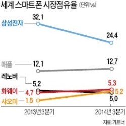½ÃÀåÁ¶»ç¾÷ü °¡Æ®³Ê¿¡ µû¸£¸é »ï¼ºÀüÀÚ´Â 3ºÐ±â ½º¸¶Æ®Æù ÆÇ¸Å·®ÀÌ 7321¸¸´ë·Î À۳⠰°Àº ±â°£º¸´Ù 700¸¸´ë ÀÌ»ó ÁÙ¾ú´Ù. ½ÃÀåÁ¡À¯À²Àº 1À§¸¦ ÁöÄ×Áö¸¸ 32.1%¿¡¼­ 24.4%·Î 8%Æ÷ÀÎÆ® °¡±îÀÌ ¶³¾îÁ³´Ù. ÃÖ´ë ÆÇ¸Å±¹ÀÎ Áß±¹¿¡¼­ ÆÇ¸Å·®ÀÌ 28.6% °¨¼ÒÇß´Ù. »þ¿À¹Ì È­¿þÀÌ µî ÇöÁö Á¦Á¶¾÷üµé¿¡ ¹Ð¸° °á°ú´Ù.