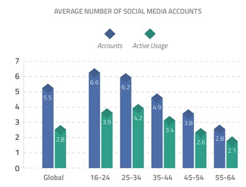 Àü¼¼°è ¼ºÀÎ ÀÎÅÍ³Ý »ç¿ëÀÚ°¡ Æò±ÕÀûÀ¸·Î 5.54°³ÀÇ SNS(¼Ò¼È³×Æ®¿öÅ©¼­ºñ½º) °èÁ¤À» º¸À¯Çϰí ÀÖ°í, ÀÌ Áß 2.82°³¸¦ ÀÚÁÖ »ç¿ëÇϰí ÀÖ´Â °ÍÀ¸·Î ³ªÅ¸³µ´Ù.