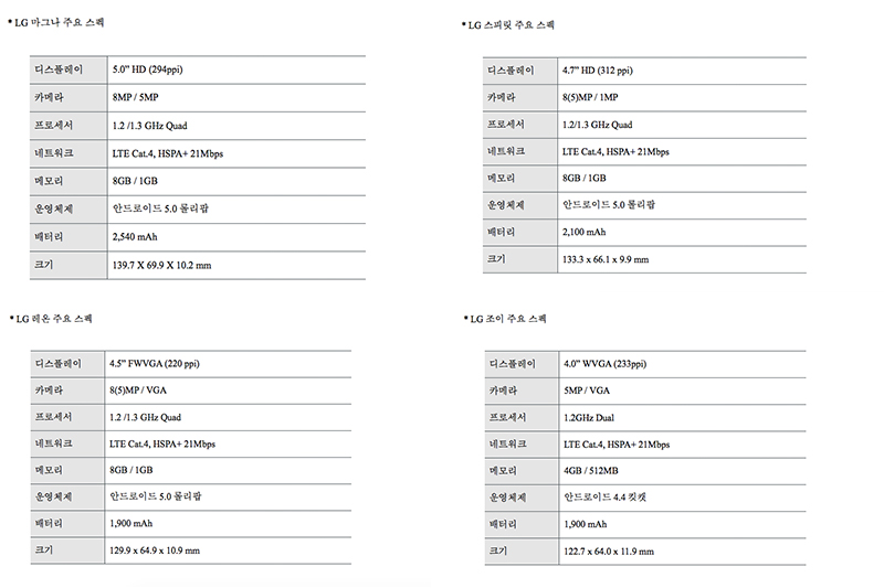 LGÀüÀÚ°¡ ¿À´Â 3¿ù2ÀÏ ½ºÆäÀÎ ¹Ù¸£¼¿·Î³ª¿¡¼­ ¿­¸®´Â ¡®¸ð¹ÙÀÏ¿ùµåÄá±×·¹½º(MWC) 2015¡¯¿¡¼­ ±Û·Î¹ú ½ÃÀåÀ» ¸ñÇ¥·Î ÇÏ´Â º¸±ÞÇü ½º¸¶Æ®ÆùÀ» °ø°³ÇÒ ¿¹Á¤ÀÌ´Ù. LGÀüÀÚ´Â 2¿ù23ÀÏ º¸µµÀڷḦ ÅëÇØ Á¦Ç°À» ¹Ì¸® °ø°³Çß´Ù. 3G¿Í LTE À̵¿Åë½Å³×Æ®¿öÅ©¸¦ ¸ðµÎ Áö¿øÇÏ´Â Á¦Ç°À¸·Î È­¸é Å©±â¿Í ¾²ÀÎ ºÎǰ¿¡ µû¶ó 4Á¾·ù·Î ³ª´¶´Ù. À̸§Àº °¢°¢ ¡®LG ¸¶±×³ª¡¯¿Í ¡®LG ½ºÇǸ´¡¯, ¡®LG ·¹¿Â¡¯, ¡®LG Á¶ÀÌ¡¯´Ù.