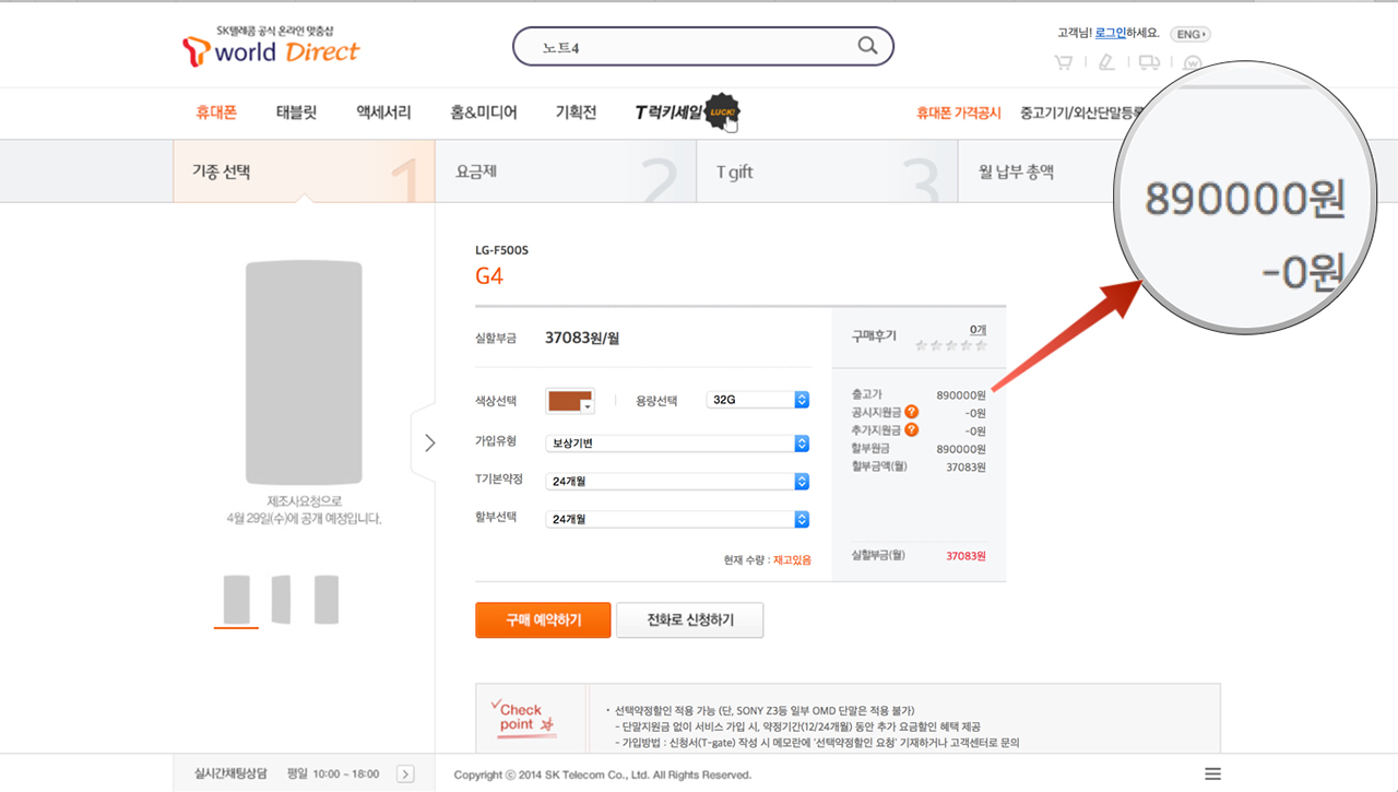 LGÀüÀÚ´Â Àü·« ½º¸¶Æ®Æù G4°¡ 4¿ù 22ÀϺÎÅÍ ÀÌÅë 3»ç¸¦ ÅëÇØ ¿¹¾à ÆÇ¸Å¸¦ ½ÃÀÛÇÑ´Ù. ¼ÒºñÀÚ´Â °¢ Åë½Å»çÀÇ °ø½Ä ¿Â¶óÀÎ À¯Åë ä³ÎÀ» ÅëÇØ ½ÅûÇÒ ¼ö ÀÖ´Ù. ÇöÀç LGÀüÀÚ´Â G4ÀÇ °ø½Ä Ãâ°í°¡¸¦ ¹ßÇ¥ÇÏÁö ¾ÊÀº »óÅ´Ù. ÀÌ ¶§¹®ÀÎÁö KT¿Í LGÀ¯Ç÷¯½º´Â Ãâ°í°¡°¡ ¸í½ÃµÇ¾î ÀÖÁö ¾Ê´Ù. ±×·±µ¥ SKÅÚ·¹ÄÞÀÇ T¿ùµå´ÙÀÌ·ºÆ®¿¡´Â 32GBÀÇ Ãâ°í°¡¸¦ 89¸¸ ¿øÀ̶ó°í ¸í½ÃÇØ ³õ¾Ò´Ù.