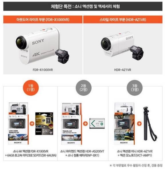 À̹ø üÇè´ÜÀº ÃʰíÈÁú(UHD, 4K) µ¿¿µ»ó ÃÔ¿µÀÌ °¡´ÉÇÑ 4K ¾×¼ÇÄ· ¡®FDR-X1000V¡¯¸¦ üÇèÇÒ ¡®¾Æ¿ôµµ¾î ¶óÀÌÇÁ(Outdoor Life)¡¯ ºÎ¹® 10¸í, ÇÏÀÌ¿£µå ¾×¼ÇÄ· ¹Ì´Ï ¡®HDR-AZ1¡¯À» üÇèÇÒ ¡®½ºÅ¸ÀÏ ¶óÀÌÇÁ(Style Life)¡¯ ºÎ¹® 10¸í µî 2°³ ºÎ¹® ÃÑ 20¸íÀ¸·Î ±¸¼ºµÈ´Ù.
