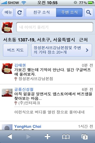 ¸ð¹ÙÀÏ ¼­ºñ½º´ä°Ô Ä£±¸ ¼Ò½Ä°ú ÁÖº¯ ¼Ò½ÄÀ¸·Î ³ª´©¾îÁ® ÀÖ½À´Ï´Ù. Áï, ÀÚ½ÅÀÇ Ä£±¸·Î µî·ÏµÈ »ç¶÷»Ó¸¸ ¾Æ´Ï¶ó ÀڱⰡ ÀÖ´Â À§Ä¡ ÁÖº¯¿¡¼­ ÀϾ°í ÀÖ´Â ¼Ò½Äµµ ±Ý¹æ ¾Ë ¼ö°¡ ÀÖ´Ù´Â ¸»¾¸ÀÔ´Ï´Ù.