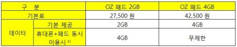 ±âÁ¸ ¡®¿ÀÁî ½º¸¶Æ®¡¯ ¿ä±ÝÁ¦·Î ÈÞ´ëÆùÀ» ÀÌ¿ëÇØ ¿Â °í°´Àº ¿À´Â 30ÀϺÎÅÍ µ¿ÀÏ ¸íÀÇ·Î ¡®¿ÀÁî ÆÐµå¡¯¿¡ °¡ÀÔ, Ãß°¡ ¿ë·®À» ¹ÞÀ» ¼ö ÀÖ´Ù. ¿ÀÁî ÆÐµå 4GB´Â ¹«Á¦ÇÑÀ¸·Î, 2GB´Â 4GB·Î ´Ã·ÁÁشٴ °ÍÀÌ È¸»ç Ãø ¼³¸íÀÌ´Ù.