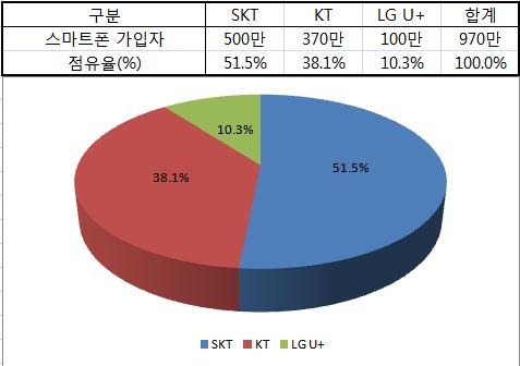 SKÅÚ·¹ÄÞ(ÀÌÇÏ SKT)°ú LGÀ¯Ç÷¯½º´Â ½º¸¶Æ®Æù °¡ÀÔÀÚ°¡ °¢°¢ 500¸¸ ¸í°ú 100¸¸ ¸íÀ» µ¹ÆÄÇß´Ù°í 14ÀÏ ¹àÇû´Ù. KTÀÇ ½º¸¶Æ®Æù °¡ÀÔÀÚµµ 13ÀÏÀ» ±âÁØÀ¸·Î 370¸¸ ¸í¿¡ ´ÞÇϱ⠶§¹®¿¡, Çö ½ÃÁ¡¿¡¼ Åë½Å 3»ç¸¦ ÇÕÄ¡¸é ±¹³» ½º¸¶Æ®Æù ÀÌ¿ëÀÚ°¡ 970¸¸ ¸íÀ» ³Ñ¾î¼± ¼ÀÀÌ´Ù.