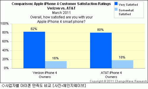 5ÀÏ(ÇöÁö½Ã°£) ¹Ì±¹ÀÇ ½ÃÀåÁ¶»ç±â°üÀΠüÀÎÁö¿þÀ̺갡 ¹ö¶óÀÌÁðÀÇ ¾ÆÀÌÆù4¿Í AT&T ÀÇ ¾ÆÀÌÆù4 »ç¿ëÀÚ 4õ98¸íÀ» »ó´ë·Î ¼ÒºñÀÚ ¸¸Á·µµ¿Í ÅëÈ­ ²÷±è Çö»óÀ» Á¶»çÇÑ °á°ú ¾ÆÀÌÆù¿¡ ´ëÇÑ ¸¸Á·µµ¿¡¼­ º° Â÷À̰¡ ¾ø´Â °ÍÀ¸·Î ³ªÅ¸³µ´Ù.