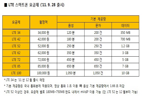Á¤¾×Á¦´Â ¡ãLTE 34(12¿ù ¿¹Á¤) ¿ù 3¸¸4000¿ø ¡ãLTE 42 ¿ù 4¸¸2000¿ø ¡ãLTE 52 ¿ù5¸¸2000¿ø ¡ãLTE 62 ¿ù 6¸¸2000¿ø ¡ãLTE 72 ¿ù 7¸¸2000¿ø ¡ãLTE 85 ¿ù 8¸¸5000¿ø ¡ãLTE 100 ¿ù 10¸¸¿ø µî 7Á¾ÀÌ´Ù. ¸ð¹ÙÀÏÀÎÅͳÝÀüÈ(mVoIP)´Â LTE 52 ÀÌ»ó ¿ä±ÝÁ¦ »ç¿ëÀÚ°¡ Á¦ÇÑÀûÀ¸·Î ÀÌ¿ëÇÒ ¼ö ÀÖ´Ù.