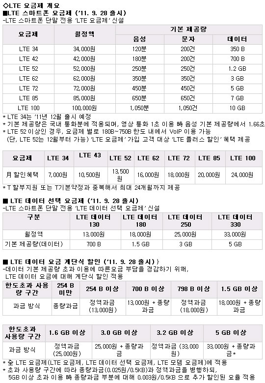 LTE µ¥ÀÌÅÍ ¿ä±ÝÀ» ¼±ÅÃÇϰí À½¼º¿ä±ÝÀº ±âÁ¸ ¿ä±ÝÁ¦¸¦ »ç¿ëÇÒ ¼ö ÀÖ´Â »óǰµµ ³ª¿Ô´Ù. µ¥ÀÌÅÍ ¿ä±ÝÀº ¡ãLTE µ¥ÀÌÅÍ 130(¿ù 1¸¸3000¿ø) 700MB ¡ãLTE µ¥ÀÌÅÍ 180(¿ù 1¸¸8000¿ø) 1.5GB ¡ãLTE µ¥ÀÌÅÍ 250(¿ù 2¸¸5000¿ø) 3GB ¡ãLTE µ¥ÀÌÅÍ 330(¿ù 3¸¸3000¿ø) 5GB´Ù. µ¥ÀÌÅÍ ±âº» Á¦°ø·®À» ³Ñ¾î°¡¸é »ç¿ë·®¿¡ µû¶ó Á¾·® °ú±ÝÇÑ´Ù.