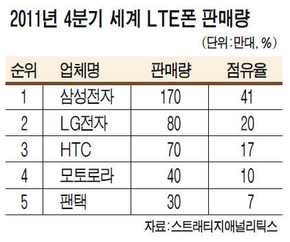 »ï¼ºÀüÀÚ´Â Áö³ 4ºÐ±â 170¸¸´ëÀÇ LTEÆùÀ» ÆÇ¸ÅÇØ 41%ÀÇ Á¡À¯À²À» ±â·ÏÇϸç 2ºÐ±â ¿¬¼Ó 1À§¸¦ Â÷ÁöÇß´Ù. LGÀüÀÚ´Â 80¸¸´ë¸¦ ÆÇ¸ÅÇϸç Á¡À¯À² 20%¸¦ ±â·Ï, 70¸¸´ë¸¦ ÆÈ¾Æ Á¡À¯À² 17%¸¦ ±â·ÏÇÑ HTC¸¦ µûµ¹¸®°í 2À§¿¡ ¿Ã¶ú´Ù. ÀÌ´Â LGÀüÀÚ°¡ 3G ½º¸¶Æ®Æù ½ÃÀå Ãʱ⠰íÀüÀ» ¸éÄ¡ ¸øÇÏ´ø »óȲ¿¡¼ ¹þ¾î³ª LTE Ãʱ⠽ÃÀå¿¡ ¼º°øÀûÀ¸·Î ¾ÈÂøÇϰí ÀÖÀ½À» º¸¿©Áشٴ Æò°¡´Ù. ÀÌ¾î ¸ðÅä·Î¶ó°¡ 40¸¸´ë¸¦ ÆÇ¸ÅÇØ 10%, ÆÒÅÃÀº 30¸¸´ë·Î 7%ÀÇ Á¡À¯À²À» ±â·ÏÇÏ¸ç ¼¼°è½ÃÀå¿¡¼ 5À§±Ç¿¡ óÀ½À¸·Î À̸§À» ¿Ã·È´Ù.