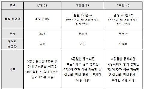 ¡®T³¢¸® ¿ä±ÝÁ¦¡¯´Â 35, 45, 55, 65, 75, 85, 100 µî 7Á¾ÀÌ´Ù. ÀÌ ¿ä±ÝÁ¦¿¡ °¡ÀÔÇÏ´Â SKÅÚ·¹ÄÞ °í°´Àº ÀÚ»ç °¡ÀÔÀÚ°£ À½¼º ÅëȻӸ¸ ¾Æ´Ï¶ó Ÿ»ç °í°´°úµµ SMS(°Ç´ç 20¿ø)¿Í MMS(°Ç´ç 100¿ø), Á¶ÀÎ(äÆÃ)À» ¹«Á¦ÇÑ ÀÌ¿ëÇÒ ¼ö ÀÖ´Ù. ¡®T³¢¸® ¿ä±ÝÁ¦¡¯ °¡ÀÔÀº LTE»Ó¸¸ ¾Æ´Ï¶ó 3G °í°´µµ °¡´ÉÇÏ´Ù.