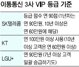 SKT´Â °¡ÀԱⰣ¿¡ µû¶ó °í°´ µî±Þ Á¡¼ö¿¡ °¡Á¡À» ÁØ´Ù. ¶§¹®¿¡ °¡ÀԱⰣ 10³âÀÌ ³ÑÀ¸¸é µî±Þ Á¡¼ö¿¡ 1.5¹è °¡ÁßÄ¡¸¦ ¹Þ¾Æ VIP ±âÁØÀÌ ¿¬ 60¸¸¿øÀ¸·Î ¶³¾îÁø´Ù. KTµµ 10³â ÀÌ»ó ¸ð¹ÙÀÏ¡¤ÀÎÅÍ³Ý °¡ÀÔÀÚ¿¡°Ô´Â ¡®ÇÑ µî±Þ Çâ»ó¡¯ÀÇ Æ¯ÀüÀ» ºÎ¿©ÇØ ¿¬ 60¸¸¿ø¸¸ ¾²¸é VIP°¡ µÉ ¼ö ÀÖ´Ù. LGU+´Â Áö³­´Þ °¡ÀԱⰣ 7³â ÀÌ»ó ÀÏ¹Ý °í°´ÀÇ µî±ÞÀ» VIP·Î Àϰý ½Â±Þ½ÃÄ×´Ù.