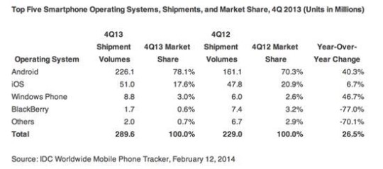 ÀÌ Áß ´ëºÎºÐÀº ¾Èµå·ÎÀ̵å OS°¡ Â÷ÁöÇß´Ù. Á¶»ç °á°ú¿¡ µû¸£¸é 95.7% Áß 78.1%´Â ¾Èµå·ÎÀ̵åÀÇ Á¡À¯À²À̾ú´Ù. iOS´Â 17.6%¿¡ ºÒ°úÇß´Ù. ¾Èµå·ÎÀÌµå ±â¹Ý ½º¸¶Æ®ÆùÀº 2013³â ÇÑ ÇØ 8¾ï´ë°¡ ÆÇ¸ÅµÆ´Ù.