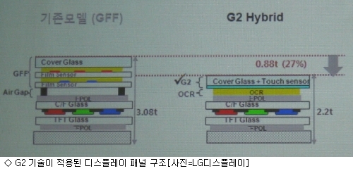 LGµð½ºÇ÷¹ÀÌ ±èº´±¸ »ó¹«( IT¸ð¹ÙÀÏ»ç¾÷ºÎ °³¹ßºÎÀå)´Â £¢ÇöÀç±îÁö ³ª¿ÍÀÖ´Â ÀϹÝÀûÀÎ ½º¸¶Æ®ÆùÀÇ ±¸¼ºÀÌ ±âÁ¸ TFT LCD ¸ðµâ À§ÂÊ¿¡ ÅÍÄ¡¼¾¼ Çʸ§°ú ±Û¶ó½º ¹Ù±ù¿¡ Ä¿¹ö±Û¶ó½º¸¦ ºÙÀÌ´Â ±¸¼ºÀ̾ú´Ù¸é £§G£§Æù¿¡¼± ÅÍÄ¡Çʸ§ÀÌ »ç¶óÁö°í ÅÍÄ¡Àü±ØÀÌ Ä¿¹ö±Û¶ó½º¿¡ ÀÏüȵƴ٣¢¸ç £¢À̸¦ G2¶ó°í ºÎ¸£´Âµ¥ ±Û¶ó½º ³» µÎ °³ÀÇ ¼¾¼Àü±ØÀ» ÀÏüȽÃÄ×´Ù£¢°í ¼³¸íÇß´Ù.
