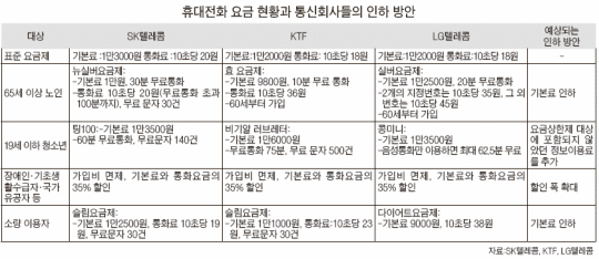 ¡¡³ëÀÎ ´ë»ó ¿ä±ÝÀÇ °æ¿ì SKÅÚ·¹ÄÞÀº ÃÖ±Ù ±âº»·á¸¦ 1000¿ø ³·Ãá ¡®´º½Ç¹ö ¿ä±ÝÁ¦¡¯¸¦ ³»³ù´Ù. ÇÑ ´Þ 1¸¸¿øÀÇ ±âº»¿ä±ÝÀ» ³»°í 30ºÐ±îÁö ¹«·á Åëȸ¦ ÇÒ ¼ö ÀÖ´Ù. ±×·¯³ª KTF ¡®È¿(üø) ¿ä±ÝÁ¦¡¯ÀÇ ±âº»·á´Â 9800¿øÀ¸·Î SKÅÚ·¹ÄÞº¸´Ù 200¿ø ½ÎÁö¸¸ ¹«·áÅëȰ¡ 10ºÐ¹Û¿¡ µÇÁö ¾Ê¾Æ ÇüÆò¼ºÀ» ¸ÂÃß´Â ¹æ¾ÈÀ» KTF´Â °ËÅäÇϰí ÀÖ´Ù. LGÅÚ·¹ÄÞÀÇ °æ¿ìµµ ³ëÀÎ ´ë»ó ±âº»·á°¡ 1¸¸2500¿øÀ¸·Î Ÿ»çº¸´Ù ³ôÀº ÆíÀÌ´Ù.
