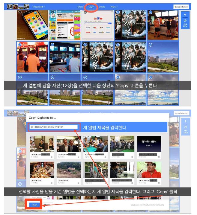 ±×·³, ¾Ù¹üÀ» ¾î¶»°Ô ¸¸µå³ª? ¡®ÃÖ±Ù Ãß°¡µÈ »çÁø(recently added)¡¯ ¸Þ´º¿¡¼ ÇÑ ¾Ù¹ü¿¡ ´ã°í ½ÍÀº »çÁøÀ» ÁöÁ¤ÇÑ ´ÙÀ½ »ó´ÜÀÇ ¡®Copy¡¯ ¹öưÀ» ´©¸£¸é ±âÁ¸ ¾Ù¹üÀÌ ¶á´Ù. ±âÁ¸ ¾Ù¹ü¿¡ ´ã°í ½ÍÀ¸¸é ¼±ÅÃÇÏ¸é µÇ°í, »õ ¾Ù¹üÀ» ¸¸µé°í ½ÍÀ¸¸é ¾Ù¹ü À̸§À» ÀÔ·ÂÇÏ¸é µÈ´Ù. ¾Ù¹ü À̸§ ÀÔ·ÂÀÌ ³¡³ª¸é ¿ÞÂÊ ¹Ø¿¡ ÀÖ´Â ¡®Copy¡¯ ¹öưÀ» ´©¸£¸é µÈ´Ù.