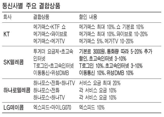 ÀÌó·³ Åë½Å »óǰÀ» ¿©·µ ÀÌ¿ëÇÏ´Â °¡Á¤¿¡¼´Â µÎ¼¼ °¡Áö ¼ºñ½º¸¦ ¹Àº °áÇÕ»óǰ¿¡ °¡ÀÔÇÏ¸é µû·Î ÀÌ¿ëÇÒ ¶§º¸´Ù ¿ä±ÝÀ» 10% ÀÌ»ó ÁÙÀÏ ¼ö ÀÖ´Ù.