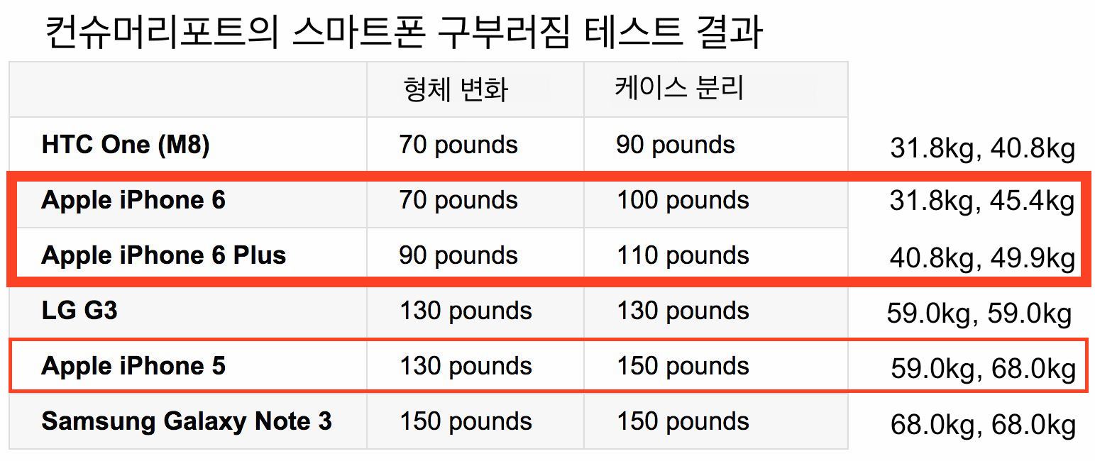 ¿ì¸®°¡ Å×½ºÆ®ÇÑ ¸ðµç ÆùÀÌ ³ª¸§´ë·Î ¸Å¿ì ´Ü´ÜÇß´Ù. ¿ì¸® Å×½ºÆ®¿¡¼´Â ¾ÆÀÌÆù ½ÅÁ¦Ç° 2Á¾ °¡¿îµ¥ (¾ÆÀÌÆù6º¸´Ù) ¾ÆÀÌÆù6 Ç÷¯½º°¡ ´õ °Çߴµ¥ ÈûÀÌ 90ÆÄ¿îµå(40.8kg)¿¡ ´ÞÇßÀ» ¶§ Çüü°¡ ´Þ¶óÁö±â ½ÃÀÛÇß´Ù. ±×¸®°í ÈûÀÌ 110ÆÄ¿îµå(49.9kg)¿¡ ´ÞÇßÀ» ¶§ ½ºÅ©¸°°ú ÄÉÀ̽º°¡ ¶³¾îÁ³´Ù. ÀÌ ¼öÄ¡´Â (´ëü·Î °ÇÏ°í Æ°Æ°ÇÑ ÆùÀ¸·Î ¿©°ÜÁö´Â) HTC ¿øº¸´Ù´Â ¾à°£ ³ô´Ù. ¾ÆÀÌÆù6º¸´Ùµµ ¾à°£ ³ô´Ù. ±×·¯³ª ´Ù¸¥ Æùº¸´Ù´Â ¾àÇß´Ù.