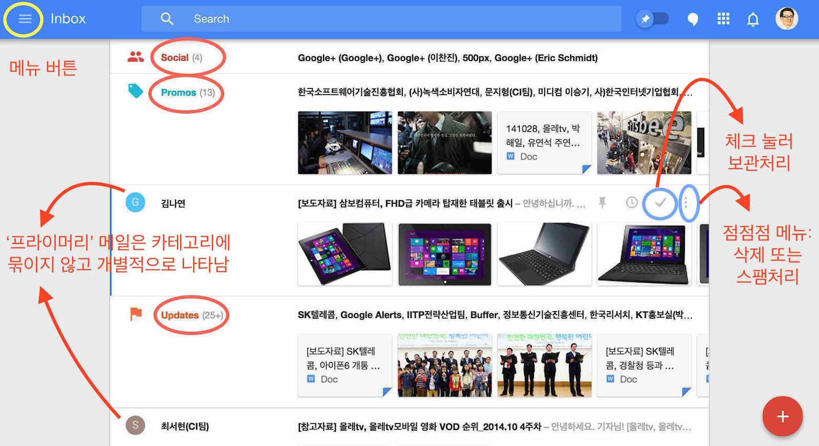 Àιڽº¿¡¼­´Â ¡®¼Ò¼È£§, ¡®ÇÁ·Î¸ð¼Ç£§, ¡®¾÷µ¥ÀÌÆ®£§ µî Ä«Å×°í¸®º°·Î ¹­¾î¼­ º¸¿©ÁÝ´Ï´Ù. Áß¿äÇÑ ¸ÞÀÏÀÌ ´ã±â´Â ¡®ÇÁ¶óÀ̸Ӹ®£§ Ä«Å×°í¸®¸¸ ¹­Áö ¾Ê°í °¢°¢ÀÇ ¸ÞÀÏÀ» µû·Î µû·Î º¸¿©ÁÝ´Ï´Ù. G¸ÞÀÏ¿¡¼­´Â Ä«Å×°í¸®º°·Î ÅÇÀ» ´­·¯¾ß Çߴµ¥, ÀÌ·¸°Ô ÇÁ¶óÀ̸Ӹ®¸¦ Á¦¿ÜÇÏ°ï ¹­¾î¼­ º¸¿©Áֱ⠶§¹®¿¡ ù È­¸é¿¡¼­ Àüü¸¦ ÆÄ¾ÇÇϱⰡ ÈξÀ ½±½À´Ï´Ù.