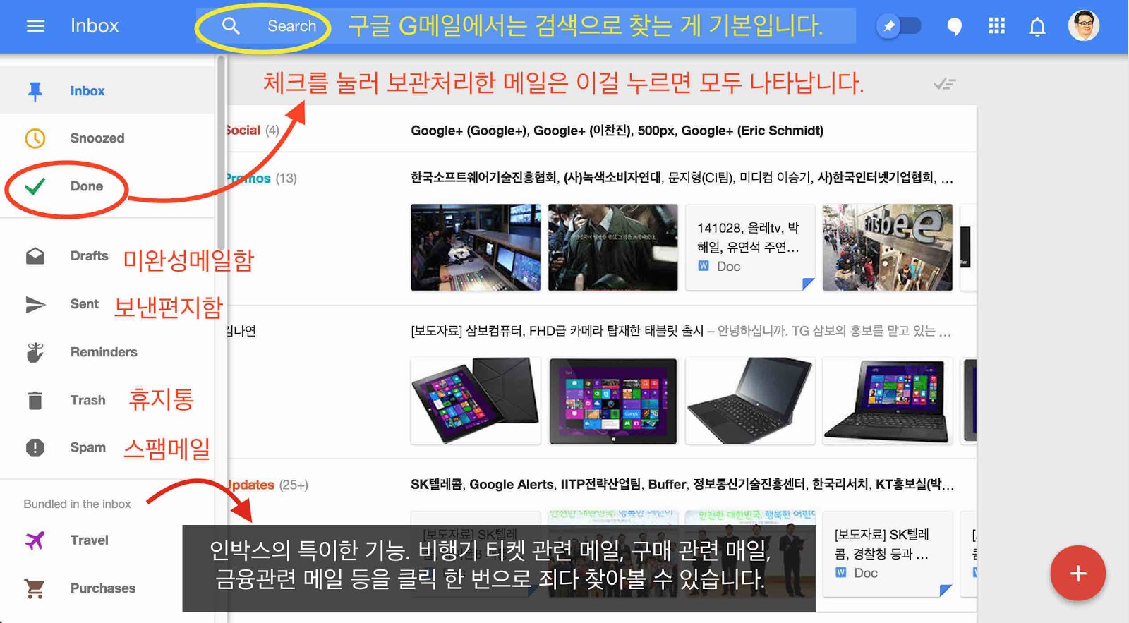 ¿ÞÂÊ À§ ¸Þ´º¹Ú½º¸¦ Ŭ¸¯Çϸé À§¿Í °°ÀÌ ÆîÃÄÁý´Ï´Ù. ¿©±â¼­ ¡®Done¡¯À» Ŭ¸¯ÇÏ¸é ±×µ¿¾È º¸°üó¸®ÇÑ ¸ÞÀÏÀÌ ÁË´Ù ¶å´Ï´Ù. »ç½Ç G¸ÞÀÏ¿¡¼­´Â Àü¿¡ ¹Þ¾Ò´ø ¸ÞÀÏÀ» ãÀ» ¶© ¸Ç À§ÀÇ °Ë»öâÀ» ÀÌ¿ëÇÏ´Â °Ô ÆíÇÏÁÒ. ¡®Done¡¯ À§¿¡ ÀÖ´Â ¡®Snoozed¡¯´Â ¸ÞÀÏÀ» ÀÐ°í ³ªÁß¿¡ ´Ù½Ã ¶ß°Ô ÇÏ´Â ±â´ÉÀε¥, Àú´Â º°·Î ¾µ¸ð ¾ø´Â ±â´ÉÀ̶ó°í »ý°¢ÇÕ´Ï´Ù.