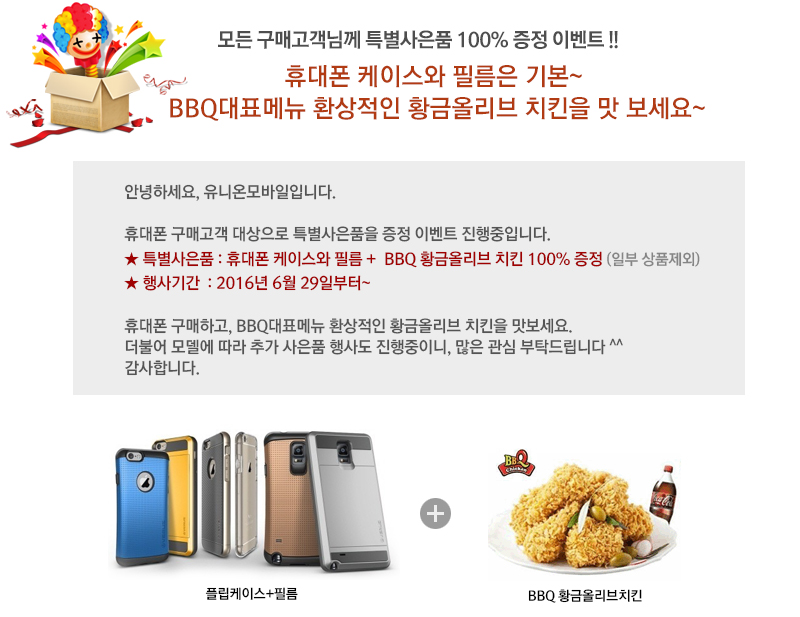 ÈÞ´ëÆù ±¸¸Å°í°´ ´ë»óÀ¸·Î Ưº°»çÀºÇ°À» ÁõÁ¤ À̺¥Æ® ÁøÇàÁßÀÔ´Ï´Ù. ¡Û Ưº°»çÀºÇ° : ÈÞ´ëÆù ÄÉÀ̽º¿Í Çʸ§ + BBQ Ȳ±Ý¿Ã¸®ºê ġŲ 100% ÁõÁ¤(ÀϺΠ»óǰÁ¦¿Ü) ¡Û Çà»ç±â°£ : 2016³â6¿ù29ÀϺÎÅÍ~ ¡Ø BBQ Ȳ±Ý¿Ã¸®ºêġŲÀº °³ÅëÈÄ 14ÀÏ ÀÌÈÄ¿¡ °³º° ¹ß¼ÛµË´Ï´Ù.