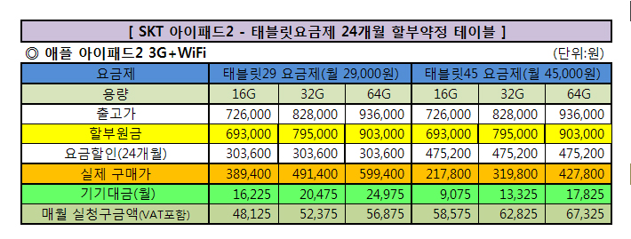 SKT ¾ÆÀÌÆÐµå2 ÅÂºí¸´ 24°³¿ù ÇҺξàÁ¤ Å×ÀÌºí ¾È³»