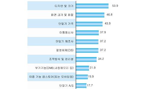 ½º¸¶Æ®ÆùÀ» ±¸¸ÅÇÒ ¶§ ÀÌ¿ëÀÚµéÀº ¡®µðÀÚÀÎ ¹× Å©±â(53.9%)¡¯³ª ¡®È­¸é Å©±â ¹× È­Áú(46.8%)¡¯, ¡®´Ü¸»±â °¡°Ý(43.9%)¡¯À» ÁÖ·Î °í·ÁÇÏ´Â °ÍÀ¸·Î Á¶»çµÆ´Ù.