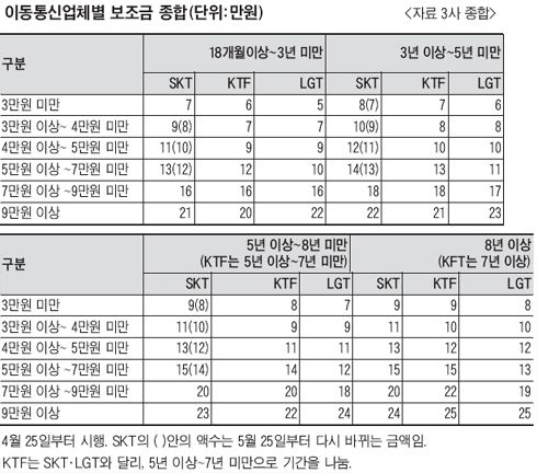 26ÀÏÀ̸é ÈÞ´ëÀüÈ­±â º¸Á¶±Ý Áö±ÞÀÌ ºÎȰµÈ Áö ²À ÇÑ ´Þ°°¡ µÈ´Ù. SKÅÚ·¹ÄÞ¡¤KTF¡¤LGÅÚ·¹ÄÞ µî À̵¿Åë½Å Åë½Å¾÷üµéÀº Áö³­ ÇÑ ´Þ°£ °¢ »çº°·Î 2~3Â÷·Ê ´Ü¸»±â º¸Á¶±Ý Áö±Þ ±Ô¸ð µîÀ» ÀçÁ¶Á¤Çϸç Áö±Þ ±âÁؾÈÀ» ¸¶·ÃÇß´Ù. ´ëü·Î º¸¸é ´Ü¸»±â º¸Á¶±Ý Áö±Þ ±Ô¸ð´Â ½ÃÀåÁ¡À¯À²´ë·Î SKÅÚ·¹ÄÞÀÌ °¡Àå ¸¹°í, ´ÙÀ½Àº KTF, LGÅÚ·¹ÄÞ ¼ø¼­ÀÌ´Ù. ÇÏÁö¸¸ º¸Á¶±Ý Â÷À̰¡ 1¸¸~2¸¸¿ø ¾ÈÆÆÀ¸·Î Å« Â÷À̰¡ ¾ø´Â µ¥´Ù, »ç¿ëÀÚÀÇ °¡ÀÔ ±â°£°ú ¿ù Æò±Õ »ç¿ë¾×¼ö¿¡ µû¶ó º¸Á¶±Ý Áö±Þ ±Ô¸ð°¡ Á¦°¢°¢À̱⠶§¹®¿¡ ²Ä²ÄÈ÷ µûÁ®ºÁ¾ß ÇÑ´Ù.¡´Ç¥ ÂüÁ¶¡µ ¶Ç ¾ÕÀ¸·Î´Â À̵¿Åë½Å¾÷üµéÀÌ º¸Á¶±Ý Áö±Þ ±âÁØÀ» ÀçÁ¶Á¤ÇÏ´õ¶óµµ ÇÑ ´Þ¾¿ À¯¿¹±â°£À» µÎ°í ½ÃÇàÀ» ÇÑ´Ù´Â Á¡µµ À¯ÀÇÇØ¾ß ÇÑ´Ù.