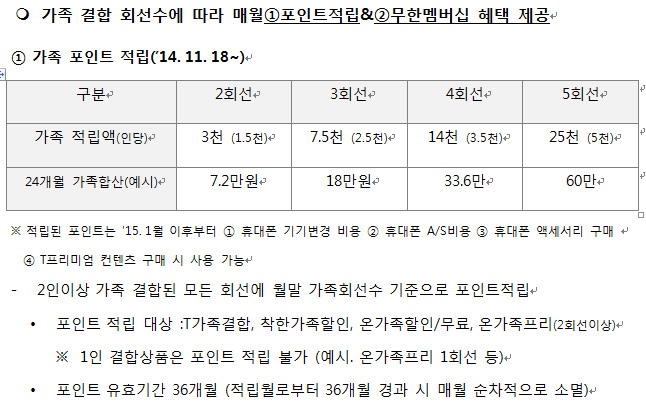 1.»óǰ °³¿ä °¡°èÅë½Åºñ °æ°¨°ú »óǰ/¼ºñ½º °æÀï ¼±µµ¸¦ À§ÇØ °í°´ÀÇ ÈÞ´ëÆù ±¸¸Å ºÎ´ãÀ» ȹ±âÀûÀ¸·Î ³·Ãâ ¼ö ÀÖ´Â ¡®T°¡Á· Æ÷ÀÎÆ®¡¯Á¦µµ ½ÃÇà 2ÀÎ ÀÌ»ó ÈÞ´ëÆù °áÇÕÇÑ ¸ðµç °¡Á·¿¡°Ô ¸Å¿ù ÃÖ´ë 2¸¸5õ¿ø Æ÷ÀÎÆ® Àû¸³& ¹«ÇѸâ¹ö½Ê ÇýÅà Á¦°ø - SKT¿¡¼ ¿î¿µ ÁßÀÎ °¡Á· °áÇÕ»óǰ(T°¡Á·ÇýÅÃ, ÂøÇÑ °¡Á·ÇÒÀÎ, ¿Â°¡Á·ÇÒÀÎ/¹«·á/ÇÁ¸®) Áß 1°¡Áö ÀÌ»ó¿¡ 2ÀÎÀÌ»ó °áÇÕµÈ ¸ðµç °í°´¿¡°Ô ÀÚµ¿À¸·Î ÇýÅà Á¦°ø(º°µµ ½Åû ÇÊ¿ä ¾øÀ½) - ÇöÀç °áÇÕÇÏÁö ¾ÊÀº ±âÁ¸ °í°´µµ 2ÀÎ ÀÌ»ó °¡Á· ÈÞ´ëÆù °áÇÕ¸¸ Çϸé ÇýÅà Á¦°ø - Àû¸³µÈ Æ÷ÀÎÆ®´Â °¡Á·ÀÌ ±â±âº¯°æ ½Ã, Çö±Ýó·³ »ç¿ë °¡´É - ¼ºñ½º ÀÌ¿ë½Ã ¹«ÇÑ ¸â¹ö½Ê Àû¿ë ÀÚ¼¼ÇÑ ³»¿ëÀº ÇÏ´Ü ³»¿ë ÂüÁ¶ Çϼ¼¿ä. °¨»çÇÕ´Ï´Ù. ![]() Q1. T°¡Á· Æ÷ÀÎÆ®°¡ ¹º°¡¿ä? °¡Á·³¢¸® 2ÀÎÀÌ»ó ¸ðÀ̱⸸ Çϸé, ±â±âº¯°æ½Ã Çö±Ýó·³ »ç¿ëÇÒ ¼ö ÀÖ´Â Æ÷ÀÎÆ®°¡ ÀÚµ¿À¸·Î Àû¸³µÇ´Â ÆÄ°ÝÀûÀÎ °í°´ÇýÅà ÇÁ·Î±×·¥ÀÔ´Ï´Ù Q2.2ÀÎÀÌ»ó °¡Á·³¢¸® ¾î¶»°Ô ¸ðÀÌ¸é µÇ³ª¿ä? ±âÁ¸¿¡ ÂøÇѰ¡Á·ÇÒÀÎ, T°¡Á·ÇýÅÃ, ¿Â°¡Á·ÇÒÀÎ, ¿Â°¡Á·¹«·á, ¿Â°¡Á·ÇÁ¸® °áÇÕ»óǰ¿¡ °¡ÀÔµÈ °í°´´ÔÀ̶ó¸é º°µµÀÇ ½ÅûÀýÂ÷ ¾øÀÌ, T°¡Á· Æ÷ÀÎÆ® Á¦µµ°¡ ½ÃÇàµÈ ³¯Â¥ºÎÅÍ ÀÚµ¿À¸·Î Æ÷ÀÎÆ®°¡ Àû¸³µË´Ï´Ù. Q3.ÃÖ´ë 5ȸ¼± °áÇÕ °¡´ÉÇÏ´Ù°í ÇßÀ¸³ª 5ȸ¼± °áÇÕÇÁ·Î±×·¥Àº ÂøÇÑ °¡Á·ÇÒÀÎ ¹Û¿¡ ¾øÁö ¾Ê³ª¿ä? ³ª¸ÓÁö °áÇÕµµ 5ȸ¼± °¡´ÉÇÑÁö¿ä? ÂøÇѰ¡Á·ÇÒÀΰú ¿Â°¡Á·ÇÒÀÎÀÌ 5ȸ¼±±îÁö °¡´ÉÇÕ´Ï´Ù. ÂøÇѰ¡Á·ÇÒÀÎ ÇÁ·Î¸ð¼ÇÀº Á¾·á¿¹Á¤À̳ª, Á¾·áÈÄ¿¡µµ T°¡Á·°áÇÕ(±¸.ÂøÇѰ¡Á·ÇÒÀÎ)Àº °¡ÀÔ °¡´ÉÇÕ´Ï´Ù. (¹«¼±°£ °áÇÕ ½Ã °¡Á·°£ µ¥ÀÌÅÍ »ý¼º/°øÀ¯, ÄÁÅÙÃ÷ °øÀ¯ µîÀÇ ÇýÅà Á¦°ø) Q4.Æ÷ÀÎÆ® »ç¿ë½Ã ÃÖÀú±Ý¾×°ú ÃÖ´ë±Ý¾× Á¦ÇÑÀÌ ÀÖ´ÂÁö? ÃÖ´ë, ÃÖÀú ±Ý¾× Á¦ÇÑÀº ¾ø½À´Ï´Ù¸¸, ´Ü¸» ±âº¯ ½Ã ÇҺοø±ÝÀ» ÃʰúÇÒ ¼ö ¾ø½À´Ï´Ù. Q5. °¡Á· ¹Ì°áÇÕ °í°´Àº ÇØ´ç ÇýÅÃÀ» ÀÌ¿ëÇÒ ¼ö ¾ø³ª¿ä? ³×, °¡Á·°áÇÕ °í°´¸¸ ÀÌ¿ëÀÌ °¡´ÉÇÕ´Ï´Ù. °¡Á·°áÇÕÀÌ ¾ÈµÈ °í°´Àº ÈÞ´ëÆù³¢¸®¸¸ °áÇÕT°¡Á·°áÇÕ(±¸.ÂøÇѰ¡Á·ÇÒÀÎ)ÇÏ½Ã¸é Æ÷ÀÎÆ® Àû¸³ÀÌ °¡´ÉÇÕ´Ï´Ù. Q6. °¡Á· °áÇÕÀº ¾ÈÇÏ°í ±âÁ¸¿¡ ·¹Àκ¸¿ì Æ÷ÀÎÆ® º¸À¯ÇÑ °æ¿ì, ±âº¯ ½Ã »ç¿ëÇÒ ¼ö ÀÖ´ÂÁö? ³×, »ç¿ë °¡´ÉÇÕ´Ï´Ù. ·¹Àκ¸¿ì Æ÷ÀÎÆ®ÀÇ »ç¿ëó°¡ È®´ëµÈ °ÍÀ¸·Î ·¹Àκ¸¿ì Æ÷ÀÎÆ®´Â º°µµÀÇ °¡Á·°áÇÕ ¾øÀÌ »ç¿ëÀÌ °¡´ÉÇÕ´Ï´Ù. Q7.Æ÷ÀÎÆ®ÀÇ À¯È¿±â°£ÀÌ 3³âÀÎ ÀÌÀ¯´Â ¹«¾ùÀΰ¡¿ä? Æò±Õ ±âº¯ÁÖ±âÀÎ 24°³¿ù ´ëºñ +12°³¿ùÀ» ´Ã¸° ±âÁØÀÔ´Ï´Ù. 36°³¿ù À̳» Æò±ÕÀûÀ¸·Î ¾à90%°¡ ±âº¯À» Çϸç, °¡Á· Æ÷ÀÎÆ®¸¦ °øÀ¯ÇÒ ¼ö ÀÖÀ¸¹Ç·Î 36°³¿ù À̳»¸é ¸ðµÎ »ç¿ë °¡´ÉÇÒ °ÍÀ¸·Î ¿¹»óµÇ¾î »êÁ¤µÈ ±âÁØÀÔ´Ï´Ù. Q8. °¡Á· Áß ÀϺΰ¡ Å»ÅðÇÏ´Â °æ¿ì ÇØ´ç °¡Á·ÀÇ Æ÷ÀÎÆ®´Â ¼Ò¸êµÇ³ª¿ä? ¾Æ´Ï¿ä, ±âÁ¸¿¡ Àû¸³µÈ Æ÷ÀÎÆ®´Â À¯ÁöµÇ¸ç, ÀÌÈÄ ÁÙ¾îµç °¡Á·È¸¼±¼ö ±âÁØÀÇ Æ÷ÀÎÆ®·Î °áÇÕµÈ °¡Á·È¸¼±¿¡ ÇÑÇØ¼ Æ÷ÀÎÆ® Àû¸³ÀÌ µË´Ï´Ù. (°¡Á· °áÇÕÀ» ÇØÁöÇÑ È¸¼±Àº ±âÁ¸¿¡ Àû¸³ÇÑ Æ÷ÀÎÆ®´Â À¯ÁöµÇ³ª, Ãß°¡ Àû¸³Àº ÁߴܵÊ) Q9. °¡Á· °áÇÕÀ» ÇØÁöÇߴµ¥, Àû¸³µÈ Æ÷ÀÎÆ®°¡ ÀÖ´Â °æ¿ì ±âº¯½Ã »ç¿ëÀÌ °¡´ÉÇѰ¡¿ä? ³×, ±âº¯½Ã Àû¸³µÈ Æ÷ÀÎÆ® »ç¿ëÀÌ °¡´ÉÇÕ´Ï´Ù. (Æ÷ÀÎÆ®»ç¿ëÀº ¡¯15. 1¿ùºÎÅÍ °¡´É) ´Ü, °áÇÕÇØÁö »óÅÂÀÇ °æ¿ì °¡Á·ÇÕ»ê »ç¿ëÀº ºÒ°¡ÇÕ´Ï´Ù. Q10.ÀÌ¿ë Á¦¾à¿¡ Á¦¾àÀÌ ÀÖ³ª¿ä? ÇÁ¸®Å¬·´, ÇÁ¸®¹Ì¾öÆÐ½º µî ´Ù¸¥ ÇÁ·Î±×·¥°ú Áߺ¹ Àû¿ë ¿©ºÎ, ºÐ¸®¿ä±ÝÁ¦ ¼±Åà ½Ã ÀÌ¿ë °¡´É ¿©ºÎ, ¹«¾àÁ¤½Ã ÀÌ¿ë °¡´É ¿©ºÎ µî ´Ù¸¥ ÇÁ·Î±×·¥°ú Áߺ¹ Àû¿ë °¡´ÉÇÕ´Ï´Ù. Q11.µ¿ÀϸíÀÇ ´Ùȸ¼± º¸À¯ÀÇ °æ¿ì °áÇÕ °¡´ÉÇѰ¡? °áÇÕ ºÒ°¡ÇÏ´Ù¸é °áÇյǾîÀִ ȸ¼± ±âº¯½Ã¸¸ ÇýÅà °¡´ÉÇѰ¡? ¾Æ´Ï¿ä, ´ç»ç °¡Á·°áÇÕ»óǰÀº ±âº»ÀûÀ¸·Î µ¿ÀϸíÀÇ 1ȸ¼± °áÇÕ ¿øÄ¢ÀÔ´Ï´Ù (´Ü, ¿Â°¡Á·ÇÒÀÎÀÇ °æ¿ì 2009³â5¿ù ÀÌÀü °¡ÀÔÀÚ´Â µ¿ÀϸíÀÇ °áÇÕ °¡´ÉÇÕ´Ï´Ù. Æ÷ÀÎÆ® »ç¿ëÀº °áÇյǾî Àִ ȸ¼±ÀÌ ±âº¯½Ã¿¡ »ç¿ëÇÒ ¼ö ÀÖ½À´Ï´Ù.) Q12.·¹Àκ¸¿ì Æ÷ÀÎÆ®µµ °¡Á·°£ ÇÕ»ê °¡´ÉÇѰ¡? ¾Æ´Õ´Ï´Ù. ·¹Àκ¸¿ì Æ÷ÀÎÆ®´Â º»ÀÎÀÇ Æ÷ÀÎÆ®¸¸ »ç¿ë °¡´ÉÇÕ´Ï´Ù. (·¹Àκ¸¿ì Æ÷ÀÎÆ®ÀÇ »ç¿ëó°¡ È®´ëµÈ °ÍÀÓ) Q13.·¹Àκ¸¿ì Æ÷ÀÎÆ®¿Í T°¡Á· Æ÷ÀÎÆ®ÀÇ Â÷ÀÌÁ¡Àº ¹«¾ùÀΰ¡¿ä? º°°³ÀÇ ±âÁذú ¼º°ÝÀ» °¡Áø Æ÷ÀÎÆ® ÀÔ´Ï´Ù. ·¹Àκ¸¿ì Æ÷ÀÎÆ®ÀÇ »ç¿ëó¸¦ Æ÷ÀÎÆ®Ã³·³ ±âº¯ ½Ã »ç¿ëÇÒ ¼ö ÀÖµµ·