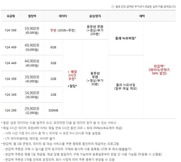KT Y24 ¿ä±ÝÁ¦ Ãâ½Ã ¾È³» ¾È³» µå¸³´Ï´Ù.(2016.3.7ÀÏ ±âÁØ) Y24 ¿ä±ÝÁ¦ : ¸¸ 24¼¼ ÀÌÇϸ¦ À§ÇÑ Æ¯º°ÇÑ ÇýÅÃÀÌ ´õÇØÁø µ¥ÀÌÅÍ ¼±Åà ¿ä±ÝÁ¦ (Y24 299 ~ 599 ¿ä±ÝÁ¦) ![]() ¡Ø À¯ÀÇ»çÇ× ¡Û 2016³â 12¿ù 31ÀϱîÁö °¡ÀÔ °¡´ÉÇÕ´Ï´Ù. (´Ü, °¡ÀÔ ÀÌÈÄ ÇØÁö Àü±îÁö ¿ä±ÝÁ¦ Áö¼Ó ÀÌ¿ë °¡´É) ¡Û LTE ´Ü¸» °í°´¿¡ ÇÑÇÏ¿© °¡ÀÔ °¡´ÉÇÕ´Ï´Ù. ¡Û ¸¸ 24¼¼±îÁö °¡ÀÔ, »ç¿ë °¡´ÉÇϸç, ¸¸ 25¼¼ »ýÀÏ ÀÍ¿ù 1ÀÏ ½ÃÁ¡ µ¿ÀÏ ±Ý¾×´ë µ¥ÀÌÅÍ ¼±Åà ¿ä±ÝÁ¦·Î ÀÚµ¿ ÀüȯµË´Ï´Ù. ¡Û °¡ÀÔÀÚ 1Àδç 1°³ÀÇ ¹øÈ£¿¡ ´ëÇØ °¡ÀÔ °¡´É ÇÕ´Ï´Ù. (û¼Ò³â ¿ä±ÝÁ¦¿Íµµ Áߺ¹ °¡ÀÔ ºÒ°¡) ¡Û ¿ä±ÝÁ¦ÀÇ ±âº» Á¦°ø·®Àº °¡ÀÔÀϼö¿¡ µû¶ó ÀÏÇÒ Á¦°øµË´Ï´Ù. ¡Û Y24 499/599 ¿ä±ÝÁ¦ °¡ÀÔÀÚ´Â ¿Ã·¹tv¸ð¹ÙÀÏÀ» 2³â°£ ¹«·á·Î ÀÌ¿ë °¡´ÉÇÕ´Ï´Ù.(´Ü, Ÿ¿ä±ÝÁ¦·Î º¯°æ ½Ã ÀÚµ¿ÇØÁö) ¡Ø ¿Ã·¹ tv ¸ð¹ÙÀÏÀÇ »çÁ¤À̳ª °è¾à º¯°æ ½Ã ÄÁÅÙÃ÷ Á¦°øÀÌ º¯°æ/Á¾·áµÉ ¼ö ÀÖÀ¸¸ç, º¯°æ ¶Ç´Â Á¾·á µÉ °æ¿ì »çÀü¿¡ App ¹× ¿Ã·¹´åÄÄÀ» ÅëÇØ °øÁö µË´Ï´Ù. Y24 ¿¡¼ Á¦°øµÇ´Â ¿Ã·¹ tv¸ð¹ÙÀÏ(ÀϺΠä³Î Á¦¿Ü)Àº ¾à 50¿©°³ ½Ç½Ã°£ ä³Î°ú °íÈÁú VOD 8¸¸¿© Æí(¹«·á 2¹é¿© Æí) ½ÃûÀÌ °¡´ÉÇÑ ¼ºñ½º ÀÔ´Ï´Ù. ¡Û º» ¿ä±ÝÁ¦´Â ¿ä±ÝÇÒÀÎÀÌ ¹Ý¿µµÈ °¡°ÝÀ¸·Î Á¦°øÇÏ´Â ¡°¼ø¾×¡± ¿ä±ÝÁ¦·Î½á, ±âÁ¸ÀÇ ¿ä±ÝÇÒÀÎ ÇÁ·Î±×·¥ µîÀÌ Áߺ¹ Àû¿ëµÇÁö ¾Ê½À´Ï´Ù. ¿¹) ¿ä±ÝÇÒÀÎ ÇÁ·Î±×·¥, »ç¿ë±â°£ ¼±ÅÃÇÒÀÎ ¼ºñ½º, ¾àÁ¤ÇÒÀÎ ÇÁ·Î±×·¥, ¿ì·®°í°´ Àå±âÇÒÀÎ ÇÁ·Î±×·¥, ±âº¯Æ÷ÀÎÆ® ÇÁ·Î±×·¥, SIMple Àû¸³ ¡Û ÇÁ·Î±×·¥Àº °¡ÀÔ Á¦ÇÑ, Àå±â ÇÒÀÎ ¸¶Àϸ®Áö ¹× º¸³Ê½º ¸¶Àϸ®Áö Àû¸³ ºÒ°¡ ¡Ø ´Ü, ´Ü¸» Áö¿ø±ÝÀ» ´ë½ÅÇÑ ¿ä±ÝÇÒÀÎ Áö¿ø±Ý(20%)Àº ¼±Åà °¡´É ¡Û °áÇÕÇÒÀÎ ¼ºñ½º Á¦°ø ¿©ºÎ´Â º°µµ °áÇÕ ¾à°ü¿¡ µû¶ó Á¦°øµË´Ï´Ù. ¡Û Y24 599 ¿ä±ÝÁ¦´Â µ¥ÀÌÅÍ ¹«ÇÑ(QoS) ÇýÅÃÀÌ Á¦°øµÇ¾î LTE µ¥ÀÌÅÍÃæÀü, ¾È½É, QoS ¿É¼Ç °¡ÀÔÀÌ ºÒ°¡ÇÕ´Ï´Ù. ¡Û ¿ä±ÝÁ¦¿¡ Á¦°øµÇ°Å³ª ÇÔ²² »ç¿ëÇÒ ¼ö ÀÖ´Â ºÎ°¡/±âŸ ¼ºñ½ºÀÇ »ó¼¼ ³»¿ëÀº ¿Ã·¹´åÄÄ ³» ¼ºñ½º º° ¾È³» ÆäÀÌÁö¸¦ Âü°íÇϼ¼¿ä. Y24¿ä±ÝÁ¦ ÀÚ¼¼È÷ º¸·¯°¡±â(http://product.olleh.com/wDic/productDetail.do?ItemCode=1105) °¨»çÇÕ´Ï´Ù. |