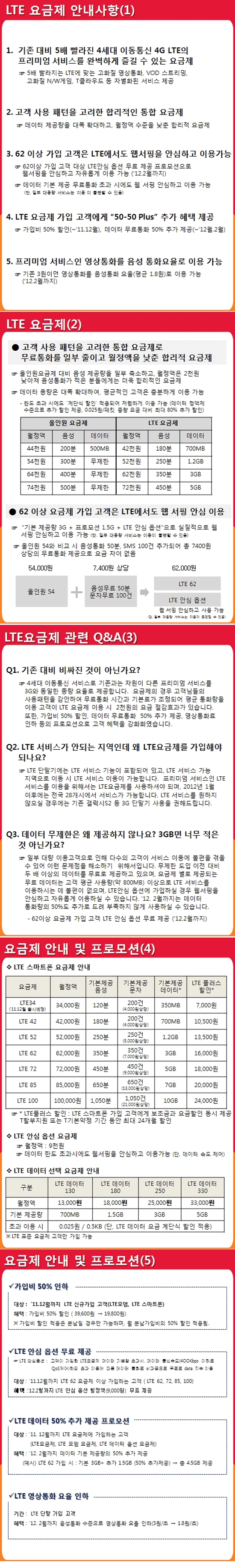 ´Ü, LTE 34 ¿ä±ÝÁ¦´Â ¡¯11. 12¿ù Ãâ½Ã ¿¹Á¤ 2. LTE ½º¸¶Æ®Æù ¿ä±ÝÁ¦ °øÅë »çÇ× - LTE ½º¸¶Æ®Æù ´Ü¸»Àº ¡°LTE ¿ä±ÝÁ¦(½º¸¶Æ®Æù¿ë)¡±¸¸ °¡ÀÔ °¡´É - ´Ü, ¡°LTE µ¥ÀÌÅÍ ¼±Åà ¿ä±ÝÁ¦¡± °¡ÀÔÀ» °í·ÁÇÏ¿© ¡°Ç¥ÁØ¿ä±ÝÁ¦¡±¸¸ Ãß°¡ÀûÀ¸·Î °¡ÀÔ Çã¿ë 3.Àü»ê±âº¯ & USIM ±âº¯ °ü·Ã - LTE ´Ü¸»Àº Àü¿ë¿ä±ÝÁ¦ Á¤Ã¥¿¡ µû¶ó, USIM ±âº¯¿¡ ÀϺΠÁ¦ÇÑÀÌ ÀÖÀ½ - ±âÁ¸ 3G ¿ä±ÝÁ¦ °¡ÀÔ°í°´Àº LTE ´Ü¸»·Î USIM±âº¯ ºÒ°¡ (´Ü, Ç¥ÁØ¿ä±ÝÁ¦¸¸ °¡´É) - ½Å±Ô LTE ¿ä±ÝÁ¦ °¡ÀÔ°í°´Àº 3G ´Ü¸»·Î USIM ±âº¯ ºÒ°¡ (´Ü, Ç¥ÁØ¿ä±ÝÁ¦¸¸ °¡´É) - USIM ±âº¯ÀÌ ºÒ°¡ÇÑ °æ¿ì´Â Àü»ê±âº¯¸¸ °¡´ÉÇϸç, ±âº¯ ½Ã ¿ä±ÝÁ¦ º¯°æ ÇÊ¿ä 4. LTE Ç÷¯½º ÇÒÀÎÁ¦µµ . ÇÒÀΰ³¿ä - LTE ½º¸¶Æ®Æù ´Ü¸»±â¸¦ ±¸ÀÔÇÏ´Â £§½Å±Ô/±âº¯£§ °í°´ÀÌ º¸Á¶±Ý(TÇÒºÎÁö¿ø or T±âº»¾àÁ¤ º¸Á¶±Ý)°ú ¿ä±ÝÇÒÀÎÀ» µ¿½Ã¿¡ Á¦°ø¹ÞÀ» ¼ö ÀÖ´Â ÇÒÀÎÁ¦µµ - ±âº»ÀûÀÎ ÇÒÀÎÁ¦µµ ½ºÅ´Àº £§3G ´õºíÇÒÀΣ§°ú À¯»çÇÔ ** LTE ¿ä±ÝÁ¦ »ó¼¼ ¾È³» »çÇ× ** Q&A Q1) LTE ¿ä±ÝÁ¦(½º¸¶Æ®Æù¿ë) °¡ÀÔ ½Ã LTE µ¥ÀÌÅÍ ¿É¼Ç ¿ä±ÝÁ¦¿¡ °¡ÀÔÇÒ ¼ö ¾ø³ª¿ä? ³×, °¡ÀÔÇÒ ¼ö ¾ø½À´Ï´Ù. LTE ¿ä±ÝÁ¦(½º¸¶Æ®Æù¿ë)´Â ¡®°è´Ü½Ä ÇÒÀΡ¯À» Àû¿ëÇÔ¿¡ µû¶ó ±âº» Á¦°ø·® ¿Ü Ãß°¡ÀûÀÎ µ¥ÀÌÅÍ ÀÌ¿ëÀ» À§ÇØ LTE µ¥ÀÌÅÍ ¿É¼Ç ¿ä±ÝÁ¦¸¦ °¡ÀÔÇÒ Çʿ䰡 ¾ø½À´Ï´Ù. (Ãʰú ÀÌ¿ë ½Ã µ¥ÀÌÅÍ ¿É¼Ç ¿ä±ÝÁ¦ ¼öÁØÀ¸·Î û±¸ ¿ä±Ý ÇÒÀÎÇÏ¿© Á¦°øÇϱ⠶§¹®) Q2) LTE ¿ä±ÝÁ¦(½º¸¶Æ®Æù¿ë)´Â ±âº» µ¥ÀÌÅÍ ¼ÒÁø ½Ã ¡®ÇѵµÂ÷´Ü¼ºñ½º¡¯¸¦ Á¦°øÇϳª¿ä? ¾Æ´Ï¿ä, LTE ¿ä±ÝÁ¦(½º¸¶Æ®Æù¿ë)´Â ¡®µ¥ÀÌÅÍ ÇѵµÂ÷´Ü¼ºñ½º¡¯¸¦ Á¦°øÇÏÁö ¾Ê½À´Ï´Ù. ´ë½Å¿¡ Ãʰú À̿뿡 µû¸¥ °í°´ÀÇ ¿ä±Ý ºÎ´ã °æ°¨À» À§ÇÏ¿© ¡®LTE µ¥ÀÌÅÍ °è´Ü½Ä ÇÒÀΡ¯À» Àû¿ëÇϰí ÀÖ½À´Ï´Ù. Q3) LTE ¿ä±ÝÁ¦(½º¸¶Æ®Æù¿ë)ÀÇ ¹®ÀÚ ±âº» ÇýÅÃÀº °Ç¼öÀΰ¡¿ä? ±Ý¾×Àΰ¡¿ä? ¹®ÀÚ ±âº» ÇýÅÃÀº ±Ý¾×À¸·Î Á¦°øµË´Ï´Ù. °í°´ÀÌ ÀÌ¿ëÇϽô ¸Þ½Ã¡ ¼ºñ½º(SMS, LMS, MMS)¿¡ µû¶ó¼ °¢°¢ 20¿ø~100¿ø µî °Çº°·Î ±Ý¾×ÀÌ Â÷°¨µË´Ï´Ù. - ¡®¹®ÀÚ 300°Ç »ó´ç¡¯ µî°ú °°ÀÌ °Ç¼ö¸¦ ÆíÀÇ»ó ÇÔ²² Ç¥±âÇÑ °ÍÀº ´Ü¹® ¸Þ½ÃÁö(SMS) ±âÁØÀ¸·Î ÀÌ¿ë °¡´É·®À» ¾Ë·Áµå¸®±â À§ÇؼÀÔ´Ï´Ù. ¶ÇÇÑ, ´ç»ç ¡®Àü°í°´ ´ë»ó SMS 50°Ç ¹«·á Á¦°ø ÇýÅá¯Àº LTE ¿ä±ÝÁ¦ÀÇ ¡®¹®Á¦ ±âº» ÇýÅᯠ³»¿¡ Æ÷ÇԵǾî ÀÖ½À´Ï´Ù. Q4) LTE ¿ä±ÝÁ¦(½º¸¶Æ®Æù¿ë)´Â ¡®ÇÁ¸®Á¸ ¼ºñ½º ÇýÅá¯À» Á¦°øÇϳª¿ä? ¾Æ´Ï¿ä, ÇÁ¸®Á¸ ÇýÅÃÀº Á¦°øÇÏÁö ¾Ê½À´Ï´Ù. (LTE ½º¸¶Æ®Æù ´Ü¸»Àº WAP NATE ¼ºñ½º ¹ÌžÀç ¿¹Á¤) ´Ü, T map(±âº»Çü) ¼ºñ½º´Â ±âº» ÇýÅÃÀ¸·Î ¹«·á Á¦°øÇÕ´Ï´Ù. Q5) 3G-LTE ´Ü¸»°£¿¡´Â ¿Ö USIM ±âº¯ÀÌ Á¦Çѵdzª¿ä? 3G¿Í LTE ´Ü¸»Àº ´Ù¸¥ Ư¼ºÀ» °¡Áø NetworkÀ» ±â¹ÝÀ¸·Î Çϱ⠶§¹®¿¡, °¢±â ´Ù¸¥ Àü¿ë¿ä±ÝÁ¦°¡ ÇÊ¿äÇϰí, ÀÌ¿¡ µû¶ó USIM ±âº¯µµ Á¦ÇÑµÉ ¼ö¹Û¿¡ ¾ø½À´Ï´Ù. (Àü»ê±âº¯Àº °¡´É). ÇÏÁö¸¸, 3G/LTE Àü¿ë µ¥ÀÌÅÍ¿ä±ÝÁ¦¸¦ °¡ÀÔÇÏÁö ¾ÊÀº Ç¥ÁØ¿ä±ÝÁ¦ °¡ÀÔ°í°´Àº USIM±âº¯ÀÌ °¡´ÉÇÕ´Ï´Ù. Q6) LTE ¿ä±ÝÁ¦(½º¸¶Æ®Æù¿ë)ÀÇ ±âº» µ¥ÀÌÅ͸¦ ¼ÒÁøÇصµ mVoIP »ç¿ëÀÌ °¡´ÉÇѰ¡¿ä? ¾Æ´Õ´Ï´Ù. LTE¿ä±ÝÁ¦(½º¸¶Æ®Æù¿ë)ÀÇ mVoIP Çã¿ëÇѵµ(180MB~750MB)´Â, ±âº» Á¦°ø µ¥ÀÌÅÍ Çѵµ ³»¿¡¼ ÃÖ´ë »ç¿ë·®À» ÀǹÌÇÕ´Ï´Ù. ¶§¹®¿¡ ±âº» Á¦°ø µ¥ÀÌÅ͸¦ ¼ÒÁøÇÑ °í°´Àº ÀÌÈÄ mVoIP »ç¿ë Á¦Çѵ˴ϴÙ. ´Ü, LTE 52 ¿ä±ÝÁ¦ÀÇ °æ¿ì, 11³â 12¿ùºÎÅÍ mVoIP ÀÌ¿ë °¡´ÉÇÕ´Ï´Ù. Q7) LTE Ç÷¯½º ÇÒÀεµ °¡ÀÔ Ã¹ ´Þ ÇÒÀαݾ×ÀÌ ÀÏÇÒ°è»êµÇ³ª¿ä? ³×, ÀÏÇÒ°è»êµË´Ï´Ù. LTE Ç÷¯½º ÇÒÀÎ °¡ÀÔ Ã¹ ´ÞÀº ¡®¿ä±ÝÁ¦ ¿ùÁ¤¾×°ú Ç÷¯½º ÇÒÀÎ ±Ý¾×¡¯ ¸ðµÎ ÀÏÇÒ °è»êµË´Ï´Ù. (´Ü¸» ÇҺαÝÀº 1/N ±Ý¾× Àü¾×ÀÌ Ã»±¸µÇ´Â ¹Ý¸é, ¿ùÁ¤¾×°ú ¿ä±Ý ÇÒÀξ×Àº ÀÏÇÒ°è»ê) Q8) LTE Ç÷¯½º ÇÒÀÎÀº TÇÒºÎÁö¿ø ÇÁ·Î±×·¥ ±â°£ÀÌ ³¡³ªµµ Áö¿øÀÌ °è¼ÓµÇ³ª¿ä? ¾Æ´Ï¿ä, LTE Ç÷¯½º ÇÒÀÎÀº ¿øÄ¢ÀûÀ¸·Î TÇÒºÎÁö¿ø ÇÁ·Î±×·¥ ÀÌ¿ë ±â°£¿¡¸¸ Á¦°øµË´Ï´Ù. ÇҺοϳ³/ÇØÁö µîÀ¸·Î TÇÒºÎÁö¿ø ±â°£ÀÌ Á¾·áµÇ¸é ÇýÅà Á¦°øµµ Áߴܵ˴ϴÙ. ´Ü, LTE Ç÷¯½º ÇÒÀÎ Áö¿øÀº TÇÒºÎÁö¿ø ±â°£¸¸ Á¦°øÇÏ´Â °ÍÀÌ ¿øÄ¢À̳ª, °í°´ ÇýÅà Ȯ´ë Â÷¿ø¿¡¼ TÇÒºÎÁö¿ø ±â°£ º¸´Ù 1°³¿ù ´õ ÇýÅÃÀ» Á¦°øÇÕ´Ï´Ù. - ¿¹) ¡®11³â 1¿ù TÇҺΠ24°³¿ù °¡ÀÔ ½Ã ¡æ ¡¯13³â 12¿ù ÇҺαⰣ Á¾·á, LTE Ç÷¯½º ÇÒÀÎÀº 14³â 1¿ù ¿ä±Ý û±¸ ½Ã±îÁö Á¦°ø Q9) TÇÒºÎÁö¿ø ÇÁ·Î±×·¥¿¡ °¡ÀÔÇÏ¿© LTE Ç÷¯½º ÇÒÀÎÀ» Á¦°ø¹Þ´Â °í°´ÀÌ ÇҺοϳ³ ½Ã ÇÒÀÎ ÇýÅÃÀ» Á¦°ø¹ÞÀ» ¼ö ÀÖ³ª¿ä? ¾Æ´Ï¿ä, ÇýÅà Á¦°øÀ