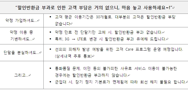 ±âÁ¸ ÇÒÀÎÁ¦µµ´Â ¡®»õ·Î¿î ´Ü¸»±â¸¦ ½Å±Ô / ±â±âº¯°æ ½Ã ÇҺΠ±¸¸ÅÇÏ´Â Á¶°Ç¡¯À¸·Î ÇÒÀÎ ÇýÅÃÀ» Á¦°øÇØÁÖ´Â º¸Á¶±Ý ¼º°ÝÀÇ ¿ä±Ý ÇÒÀÎÀ¸·Î ÇýÅÃÀ» ¹Þ´Â °í°´ÀÌ Á¦ÇÑÀûÀ̾ú½À´Ï´Ù. ¹Ý¸é, À̹ø¿¡ ½Å¼³µÈ ¾àÁ¤ÇÒÀÎÁ¦µµ´Â ´Ü¸» ÇҺΠ±¸ÀÔ µî¿¡ »ó°ü ¾øÀÌ Æ¯Á¤ ¿ä±ÝÁ¦¸¦ ÀÏÁ¤ ±â°£ µ¿¾È ¾àÁ¤ ÀÌ¿ëÇÏ´Â °í°´ ´©±¸¿¡°Ô³ª ÇÒÀÎ ÇýÅÃÀ» Á¦°øÇØ µå¸³´Ï´Ù. - Áß°í´Ü¸», ¿Ü»ê´Ü¸», Àڱ޴ܸ», ÇÒÀÎÁ¦µµ ¸¸·á °í°´ µî ±âÁ¸¿¡ ¿ä±Ý ÇÒÀÎ ºñ´ë»ó °í°´¿¡°Ôµµ ¾àÁ¤ ÇÒÀÎ ÇýÅÃÀ» Á¦°ø 2.¡®¾àÁ¤ÇÒÀÎÁ¦µµ¡¯°¡ ±âÁ¸ ÇÒÀÎÁ¦µµ ´ëºñ °í°´ ÇýÅÃÀÌ ÁÁ¾ÆÁø Á¡Àº ¹«¾ùÀΰ¡¿ä? ±âÁ¸ ÇÒÀÎ±Ý¾× ¼öÁØÀº À¯ÁöÇÏ¸é¼ ´Ü¸» ¹× ÃÖ´ë ÇÒÀÎ ±â°£ Á¦ÇÑ Á¶°ÇÀ» Àû¿ëÇÏÁö ¾Ê¾Æ, ¿ä±Ý ÇÒÀÎ ÇýÅà ¼öÇý °í°´ÀÇ ¹üÀ§°¡ ´õ¿í È®´ëµÇ¾ú½À´Ï´Ù. ¡Ø ÃÖ´ëÇÒÀÎ ±â°£ º¯°æ ¢º ±âÁ¸ : ÃÖ´ë 24(´õºí)/36(½ºÆä¼È)/30(LTE) °³¿ù ±îÁö¸¸ ÇýÅà Á¦°ø ¢º º¯°æ : Àç¾àÁ¤À» ÅëÇØ 1³â/2³â ´ÜÀ§·Î °í°´ÀÌ ¿øÇÏ¸é °è¼ÓÇØ¼ ÇÒÀÎÁ¦°øÀÌ °¡´ÉÇÕ´Ï´Ù. (ÃÖ´ë ÇÒÀÎ ±â°£ Á¦ÇÑ ¾øÀ½) 3. ±âÁ¸ ÇÒÀÎÁ¦µµ ´ëºñ »õ·Ó°Ô ½ÃÇàµÇ´Â ¡®¾àÁ¤ÇÒÀÎÁ¦µµ¡¯ÀÇ Â÷ÀÌÁ¡Àº ¹«¾ùÀΰ¡¿ä? ¿ì¼± ±âÁ¸ ÇÒÀÎ ÇÁ·Î±×·¥(½ºÆä¼È/´õºí/¿ì·®°í°´/LTEÇ÷¯½ºÇÒÀÎ)´Â ¸ðµÎ 7/1ÀÏ ÀÌÈÄ °¡ÀÔ Áß´Ü(¼¼ºÎ ½ÃÇàÀÏ º°µµ °øÁö ¿¹Á¤) µÇ°í,¡®½ºÆä¼È ¾àÁ¤ÇÒÀÎÁ¦µµ & LTE Ç÷¯½º ¾àÁ¤ÇÒÀÎÁ¦µµ¡¯·Î ÅëÇյ˴ϴÙ. °¡ÀÔ Á¶°ÇÀº ±âÁ¸ ´Ü¸» ÇҺΠ±¸¸Å & ½Å±Ô/±âº¯ ÈÄ 1°³¿ù À̳» °¡ÀÔ (½ºÆä¼ÈÇÒÀÎ), TÇÒºÎ/T±âº»¾àÁ¤ °¡ÀÔ (´õºíÇÒÀÎ), ÀÌ¿ë ±â°£ 2³â ÀÌ»ó (¿ì·®°í°´ÇÒÀÎ) ´ë½Å¿¡ ¿ä±Ý¾àÁ¤ÇÒÀÎÁ¦µµ ´ë»ó ¿ä±ÝÁ¦ ÀÌ¿ë & ±â°£ ¾àÁ¤ Á¶°ÇÀ¸·Î º¯°æµË´Ï´Ù. ÇÒÀÎ ±â°£Àº ±âÁ¸ ÃÖÀå 36°³¿ù(½ºÆä¼È), 30°³¿ù(LTE)¿¡¼ ¡®12°³¿ù or 24°³¿ù Áß ¼±Åá¯ÇÏ´Â °ÍÀ¸·Î º¯°æµÇ¾ú½À´Ï´Ù. ÇÏÁö¸¸ ¾àÁ¤ ¸¸·á ÈÄ¿¡µµ °í°´ÀÌ ¿øÇϸé Àç¾àÁ¤À» ÅëÇØ °è¼ÓÇØ¼ ¿ä±Ý ÇÒÀÎ ÇýÅÃÀ» ¹ÞÀ» ¼ö ÀÖ½À´Ï´Ù. (´Ü, ½Å¼³µÈ ¾àÁ¤ÇÒÀÎÁ¦µµ´Â ¾àÁ¤ ÇØÁö ½Ã, ÇÒÀιÝȯ±ÝÀÌ ºÎ°úµË´Ï´Ù.) 4. ÇÒÀιÝȯ±ÝÀº ¿Ö ºÎ°úÇϳª¿ä? ±âÁ¸ ÇÒÀÎÁ¦µµ´Â ¡®´Ü¸» ±¸¸Å °í°´¡¯À¸·Î °¡ÀÔ ´ë»óÀ» Á¦ÇÑÇÏ¿© º¸Á¶±Ý ÇüÅ·ΠÇÒÀÎ ÇýÅÃÀ» Á¦°øÇßÁö¸¸, »õ·Ó°Ô ½ÃÇàµÇ´Â ¾àÁ¤ÇÒÀÎÁ¦µµ´Â ƯÁ¤ ¿ä±ÝÁ¦ÀÇ ÀÌ¿ë ±â°£À» ¾àÁ¤ÇÏ´Â °í°´ÀÌ¸é ´©±¸³ª °¡ÀÔ °¡´ÉÇÑ °ÍÀ¸·Î, ¾àÁ¤ ±â°£ ¹Ì Áؼö¿¡ ´ëÇÑ ÇÒÀιÝȯ±Ý ºÎ°ú´Â ºÒ°¡ÇÇÇÕ´Ï´Ù. - ±âÁ¸ ÇÒÀÎÁ¦µµ´Â ¡®´Ü¸» ÇҺΠ¹× º¸Á¶±Ý ¾àÁ¤ µîÀ» Á¶°ÇÀ¸·Î ´ç»ç¸¦ ÅëÇØ À¯ÅëµÇ´Â New ´Ü¸»À» ½Å±Ô/±âº¯ ½Ã ±¸¸ÅÇÑ °í°´¡¯¿¡ ÇÑÁ¤ÇÏ¿© ÇÒÀÎ ÇýÅÃÀ» Á¦°øÇßÀ¸³ª, ¾àÁ¤ÇÒÀÎÁ¦µµ´Â ¡®´Ü¸» Á¶°Ç ¾øÀÌ ÀÏÁ¤ ±â°£ µ¿¾È ƯÁ¤ ¿ä±ÝÁ¦¸¦ ÀÌ¿ëÇÒ °ÍÀ» ¾àÁ¤¡¯ÇÏ´Â ¹æ½ÄÀ¸·Î, ÇâÈÄ ¹ß»ýÇÒ ±â´ë ¿ä±ÝÀÇ ÀϺθ¦ ¿ä±Ý ÇÒÀÎ ÇýÅÃÀ¸·Î Á¦°øÇÏ´Â °ÍÀÔ´Ï´Ù. ÀÌ¿ë ±â°£ ¾àÁ¤¿¡ µû¸¥ ÇÒÀιÝȯ±Ý ºÎ°ú´Â ±âÁ¸ ¡®¿ì·®°í°´¿ä±ÝÇÒÀÎÁ¦µµ¡¯¿¡¼ ÀÌ¹Ì Àû¿ëµÈ ¹Ù ÀÖÀ¸¸ç, À¯¼± Ãʰí¼Ó ÀÎÅÍ³Ý »óǰ µî¿¡¼µµ º¸ÆíÀûÀ¸·Î Àû¿ëµÇ°í ÀÖ½À´Ï´Ù. ¶ÇÇÑ, ÇÒÀιÝȯ±ÝÀº ÇØ¿Ü À̵¿Åë½Å ½ÃÀå¿¡¼µµ ÀϹÝÀûÀ¸·Î ½ÃÇàµÇ´Â Á¦µµÀÔ´Ï´Ù. ¿¹¸¦ µé¾î, ÀϺ» ÀÌÅë»ç´Â ¾àÁ¤±â°£ À̳» ÇØÁö ¶Ç´Â ¾àÁ¤ ºñ´ë»ó ¿ä±ÝÁ¦·Î º¯°æ ½Ã ÀÌ¿ë ±â°£¿¡ °ü°è¾øÀÌ ¾à ¡Í10,000(¾à 15¸¸¿ø)ÀÇ ÇÒÀιÝȯ±ÝÀ» ºÎ°úÇϰí ÀÖ½À´Ï´Ù. 5. ÇÒÀιÝȯ±Ý ±Ô¸ð°¡ ³Ê¹« Å« °Í ¾Æ´Ñ°¡¿ä? °í°´ÀÇ ÇÒÀιÝȯ±Ý ºÎ´ãÀ» ÃÖ¼ÒÈÇϱâ À§ÇØ ¡®ÀÌ¿ë ±â°£¿¡ µû¶ó ÇÒÀιÝȯ±Ý ºÎ°ú ºñÀ²ÀÌ ³·¾ÆÁöµµ·Ï ÇÒÀιÝȯ±Ý »ê½Ä¡¯À» ¼³°èÇÏ¿´½À´Ï´Ù. 24°³¿ù Â÷ ÃÑ¿ä±ÝÇÒÀÎ±Ý¾× ´ëºñ ÇÒÀιÝȯ±Ý ºñÀ²Àº ÃÖÀú 31%·Î½á ±âÁ¸ ¿ì·®°í°´¿ä±ÝÇÒÀÎ µî Ÿ »óǰ¿¡ ºñÇØ ³·Àº ¼öÁØÀ¸·Î ¼³°èÇÏ¿´½À´Ï´Ù. ![]() 6. ȸ¼±À» ÇØÁöÇÏÁöµµ ¾Ê¾Ò´Âµ¥ ¿Ö ÇÒÀιÝȯ±ÝÀ» ºÎ¿©Çϳª¿ä? (Á¾·®ÇüÀ¸·Î ¿ä±ÝÁ¦ º¯°æ, LTE ¡æ 3G ¿ä±ÝÁ¦·Î º¯°æ, À̵¿ÀüÈ ¡ê ÅÂºí¸´ ¿ä±ÝÁ¦ °£ º¯°æ ½Ã, ÇÒÀιÝȯ±Ý ºÎ°ú) ¾àÁ¤ÇÒÀÎÁ¦µµ´Â ƯÁ¤ ¿ä±ÝÁ¦¸¦ ÀÏÁ¤ ±â°£µ¿¾È ÀÌ¿ëÇÒ °ÍÀ» ¾à¼ÓÇÏ´Â °æ¿ì, ÀÌ¿¡ ´ëÇÑ ¹Ì·¡ ¿ä±Ý ¼öÀÍ¿¡ ±â¹ÝÇÏ¿© ¿ä±Ý ÇÒÀÎ ÇýÅÃÀ» Á¦°øÇØÁÖ´Â °ÍÀÔ´Ï´Ù. ÀÌ¿¡ µû¶ó, ¾àÁ¤ÇÒÀÎÁ¦µµ º°·Î ¿ä±Ý ÇÒÀÎ ¼öÁØÀÌ ¸ðµÎ ´Ù¸£°Ô ¼³°èµÇ¾î ÀÖ½À´Ï´Ù. Áï, Á¾·®Çü ¿ä±ÝÁ¦ µîÀ¸·Î º¯°æ ¶Ç´Â LTE ¡æ 3G ¿ä±ÝÁ¦·Î º¯°æ ½Ã, ¿ä±ÝÇÒÀÎ ±Ý¾× ¼öÁØÀÌ º¯°æ ÀüÈÄ ¿ä±ÝÁ¦ º°·Î ¸ðµÎ 
