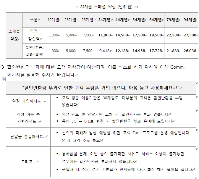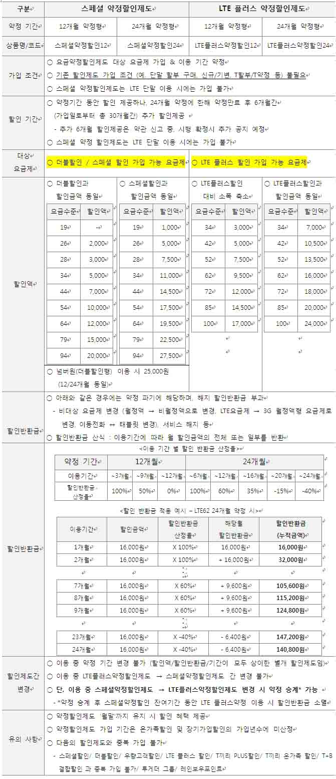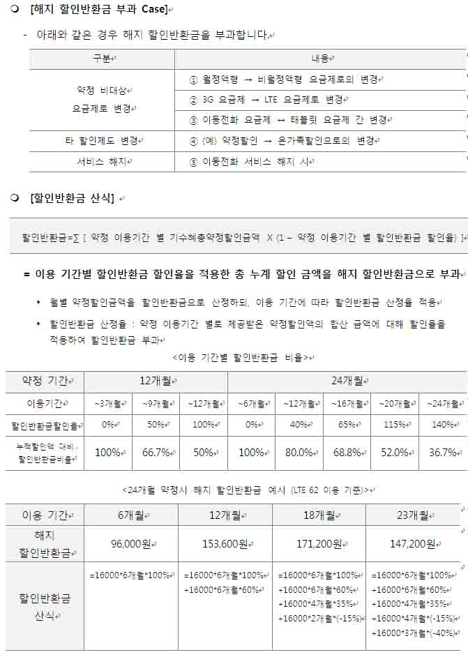 ¡Ý ƯÁ¤ ¿ä±ÝÁ¦¸¦ ÀÏÁ¤ ±â°£ µ¿¾È ÀÌ¿ëÇÒ °ÍÀ» ¾àÁ¤ÇÏ´Â °æ¿ì ´©±¸³ª ¿ä±Ý ÇÒÀÎ ÇýÅÃÀ» ¹ÞÀ» ¼ö ÀÖ´Â »õ·Î¿î ÇÒÀÎÁ¦µµ ¡Ý ½ÃÇàÀÏ `12³â 11¿ù 1ÀÏ - ±âÁ¸ ¿ä±ÝÇÒÀÎ ÇÁ·Î±×·¥ÀÎ LTEÇ÷¯½ºÇÒÀÎ/ ½ºÆä¼ÈÇÒÀÎ/ TTL½ºÆä¼ÈÇÒÀÎ/ ´õºíÇÒÀÎ/ TTL´õºíÇÒÀÎ/ ¿ì·®°í°´¿ä±ÝÇÒÀÎ Á¦µµ´Â 11¿ù 1ÀϺÎÅÍ °¡ÀÔ Áß´Ü ¿¹Á¤ÀÔ´Ï´Ù. ¡Ý ¿ä±Ý¾àÁ¤ÇÒÀÎÁ¦µµÀÇ Áßµµ ÇØÁö ½Ã ¹ß»ýÇϴ û±¸±Ý¾×Àº, ¾àÁ¤ ÇØÁö¿¡ µû¶ó ±â Á¦°øÇß´ø ÇÒÀÎ ±Ý¾×À» ¹ÝȯÇÏ´Â °ÍÀ̹ǷΠ¡®À§¾à±Ý¡¯ÀÌ ¾Æ´Ñ ¡®ÇÒÀÎ ¹Ýȯ±Ý¡¯À¸·Î ¸íĪÀ» ´ëüÇÕ´Ï´Ù. ![]() ¡Ø SKT ¿ä±Ý¾àÁ¤ÇÒÀÎÁ¦µµ ¼¼ºÎ»çÇ× °¡. ½ºÆä¼È ¾àÁ¤ ÇÒÀÎ [°¡ÀÔ ´ë»ó ¿ä±ÝÁ¦] ±âÁ¸ ¡®´õºí/½ºÆä¼ÈÇÒÀΡ¯ °¡ÀÔ °¡´É ¿ä±ÝÁ¦¿Í µ¿ÀÏ (´Ü, ¿ùÁ¤¾× 28õ¿ø ÀÌ»óÀÎ °æ¿ì¿¡¸¸ °¡ÀÔ °¡´É) - °¡ÀÔ ´ë»ó ¿ä±ÝÁ¦ : ¿ÃÀοø °è¿(ÀϹÝ/Ä¿ÇÃ/Ư¼ö/ÆÃ/¼Õ»ç¶û34/¼Ò¸®»ç¶û34), ¹«·áÀ½¼º, ¸ÂÃãÇü, ¹«·á¹®ÀÚ, ¹«·áÀ½¼ºII, ³Ñ¹ö¿ø(´õºíÇÒÀÎÇü), ÆÃ °è¿ µî - ´ë»ó ¿ä±ÝÁ¦ Áß ¿ùÁ¤¾× 19õ¿ø ÀÌ»óÀÎ °æ¿ì¿¡¸¸ °¡ÀÔ °¡´É - LTE ´Ü¸» »ç¿ë °í°´Àº ½ºÆä¼È ¾àÁ¤ °¡ÀÔ ºÒ°¡ ³ª.LTE Ç÷¯½º ¾àÁ¤ ÇÒÀÎ [°¡ÀÔ ´ë»ó ¿ä±ÝÁ¦] ±âÁ¸ ¡®LTE Ç÷¯½º ÇÒÀΡ¯ °¡ÀÔ °¡´É ¿ä±ÝÁ¦¿Í µ¿ÀÏ - LTE ½º¸¶Æ®Æù ¿ä±ÝÁ¦(ÀϹÝ/Ä¿ÇÃ/ÆÃ/Ư¼ö/°ñµç¿¡ÀÌÁö34) ´Ù.¾àÁ¤ ±â°£ ¹× ¾àÁ¤ÇÒÀÎÁ¦µµ º¯°æ 24°³¿ù ¾àÁ¤ ½Ã, ¾àÁ¤ ¸¸·á ÈÄ ÇÒÀÎÁ¦µµ À¯Áö ½Ã 6°³¿ù°£ (°¡ÀÔÀÏ·Î ºÎÅä ÃÑ 30°³¿ù°£) Ãß°¡ ÇÒÀÎ Á¦°ø(¾à°ü ½Å°í Áß. ½ÃÇà È®Á¤½Ã Ãß°¡ °øÁö ¿¹Á¤) - ´Ü, Ãß°¡ ÇÒÀÎ Á¦°ø ±â°£ Áß ¾àÁ¤ÇÒÀÎ À¯Áö Á¶°Ç ÃÖÃÊ ¾àÁ¤ÇÒÀÎÁ¦µµ °¡ÀÔ ½Ã 12°³¿ù or 24°³¿ùÁß ¼±Åà °¡ÀÔ °¡´ÉÇϳª, ¾àÁ¤ÇÒÀÎÁ¦µµ °¡ÀÔ ±â°£ Áß ¾àÁ¤ ±â°£ÀÇ º¯°æ(12°³¿ù ¡ê 24°³¿ù)Àº ºÒ°¡ ¾àÁ¤ÇÒÀÎÁ¦µµ °£ Áßµµ º¯°æ(½ºÆä¼È ¾àÁ¤ ¡ê LTE Ç÷¯½º ¾àÁ¤) ºÒ°¡ - ´Ü, 3G ½ºÆä¼È ¾àÁ¤ ¡æ LTE Ç÷¯½º ¾àÁ¤À¸·Î º¯°æ ½Ã¿¡´Â ¿¹¿ÜÀûÀ¸·Î ¾àÁ¤ ½Â°è °¡´É ![]() [ÇÒÀιÝȯ±Ý »êÁ¤ ¹× ºÎ°ú °ü·Ã ƯÀÌ »çÇ×] - 24°³¿ù ¾àÁ¤ ½Ã ¾àÁ¤¸¸·á ÈÄ 6°³¿ù°£ Ãß°¡ ÇÒÀÎ Á¦°ø ±â°£ Áß¿¡´Â, ¾àÁ¤ ¶Ç´Â ¼ºñ½º ÇØÁö ½Ã¿¡µµ ÇÒÀιÝȯ±Ý ¹ÌºÎ°ú(´Ü, ¾à°ü ½Å°íÁß. ½ÃÇà È®Á¤ ½Ã Ãß°¡ °øÁö ¿¹Á¤) - ÇÒÀιÝȯ±Ý ÇÒÀÎÀ² Àû¿ë ½Ã ¡®ÀÌ¿ë ±â°£¡¯ »êÁ¤ ±âÁØ ¾àÁ¤ ÀÌ¿ë ±â°£Àº ¡®¿ä±Ý ÇÒÀξ×ÀÌ Áö±Þ µÈ ±â°£¡¯À¸·Î ÇÑÁ¤Çϸç Á¤Áö ±â°£Àº Á¦¿Ü ÇÕ´Ï´Ù. - ÅëÈǰÁú ºÒ·®À¸·Î ÀÎÇÑ ÇØÁö, °í°´ÀÇ »ç¸Á ¶Ç´Â À̹ΠµîÀÇ »çÀ¯·Î ÇØÁö ½Ã ¾àÁ¤ ÇØÁö ÇÒÀιÝȯ±Ý ¹ÌºÎ°ú - ¿øÄ¢ÀûÀ¸·Î ¾àÁ¤ ÇÒÀÎ¾× Àüü°¡ ÇÒÀιÝȯ±Ý »êÁ¤À» À§ÇÑ ±âÁؾ×ÀÌ µÇ³ª, - 24°³¿ù ½ºÆä¼È ¾àÁ¤ÀÇ °æ¿ì¿¡´Â ¿ù º° ¾àÁ¤ÇÒÀξװú ÇÒÀιÝȯ±Ý »êÁ¤ ±âÁرݾ×ÀÌ »óÀÌÀÌÀ¯) ÇÒÀιÝȯ±Ý »êÁ¤À» À§ÇÑ ±âÁؾ×Àº ¿ùÁ¤¾×ÀÇ 27.7%¸¦ Ãʰú ÇÒ ¼ö ¾ø±â ¶§¹® ![]() |